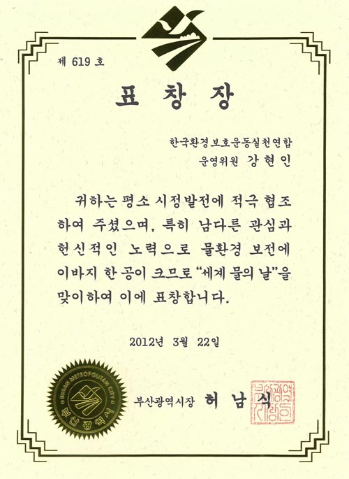 부산시에서 "세계 물의 날"을 맞이하여 물환경 보전에 이바지 한 공이 커서