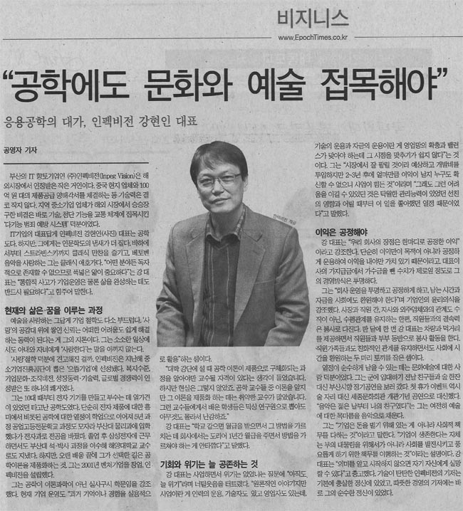 [2014년 480호 대기원시보]"공학에도 문화와 예술 접목해야" 페이지 정보 작성자 (주)인펙비전 댓글 0건 조회 1,202회 작성일 14-01-06 06:18 본문 [이 게시물은 인펙비전님에 의해 2024-08-08 18:38:28 보도자료에서 이동 됨][이 게시물은 인펙비전님에 의해 2024-08-08 18:38:56 영상자료에서 이동 됨] 목록 이전글[2014년 12월] ELECTRONICS 잡지에 비춰진 인펙비전 14.12.09 다음글2013년 나라장터 엑스포 [정보통신신문] 13.04.29