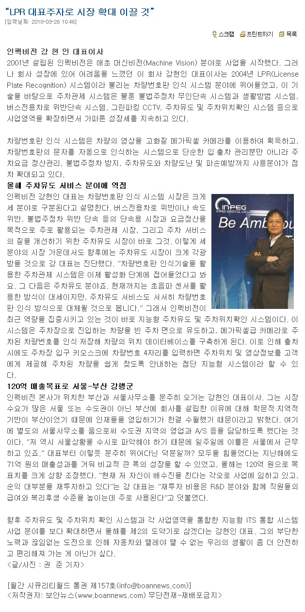2010년 3월 시큐리티월드 "LPR 대표주자로 시장 확대 이끌 것" 페이지 정보 작성자 (주)인펙비전 댓글 0건 조회 1,295회 작성일 13-02-08 02:18 본문 목록 이전글2010년 4월 시큐리티 월드 "감시 카메라 시스템의 지능화·통합 13.02.08 다음글2010년 1월 이코노미스트 "첨단 주차관제시스템 세계 공급" 13.02.08
