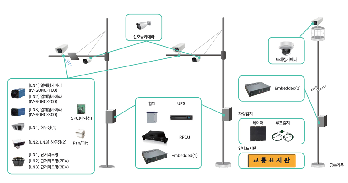 iSC4-LN1-DT1 은 2방향 (1, 2, 3)차로 교차로 단속시스템으로 ICT 기술을 활용하여 카메라 엣지단에서 카메라를 통해 수집된 영상을 실시간으로 분석하여 각종 교통법위반 차량을 단속 할 수 있는 시스템