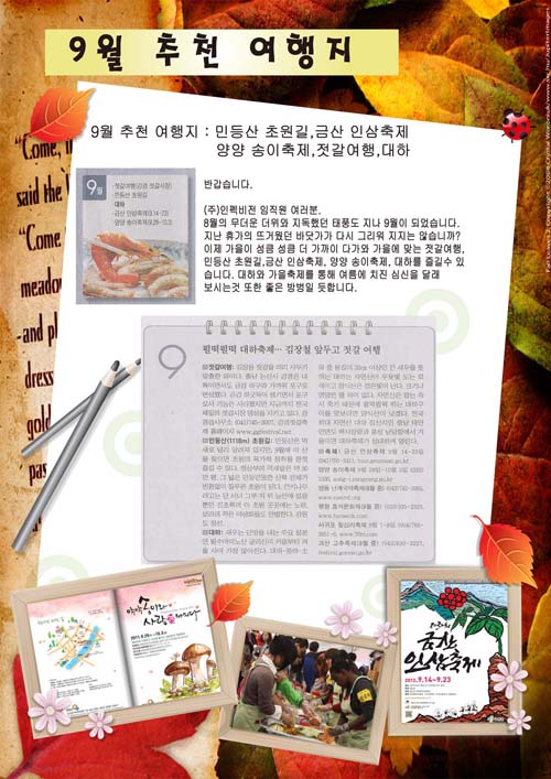 2012년 7/8/9월 추천 여행지 및 음식 페이지 정보 작성자 (주)인펙비전 댓글 0건 조회 770회 작성일 13-02-14 02:09 본문 2012년 7/8/9월 추천 여행지 및 음식 목록 이전글2012년 창립 기념일 파티! 13.02.14 다음글2012년 4/5/6월 추천 여행지 및 음식 13.02.14