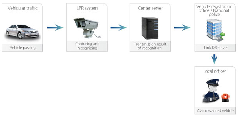 Recognizes vehicles plate number passing by road and transmits recognition result to center.Then center system separates vehicles by wanted, stolen and defaulted and provides path tracking, security of evidence, etc. quickly.